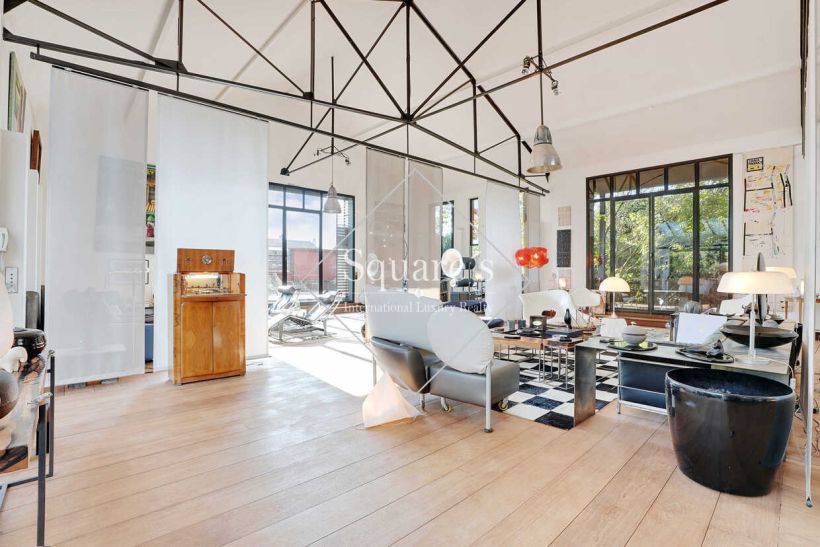 Exclusively, an industrial-style loft redesigned in 2003, measuring 6,370 square feet, opening onto a patio and a 3,300 square foot terrace on the same level. This property is spread over two levels and is composed as follows: on the ground floor, a living room, a screening room, a suite (with independent access), and two large offices (or four bedrooms). Upstairs, there is a magnificent reception room of over 100m², a dining room and a fully