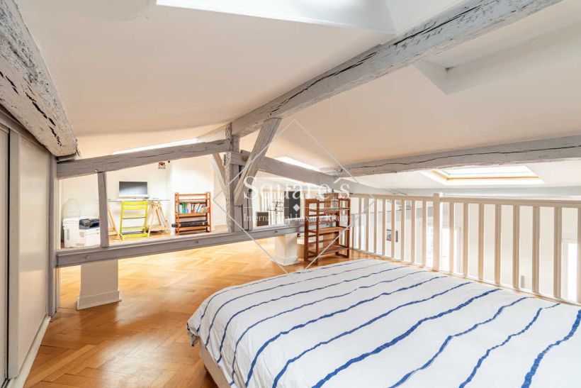 Superb 120m² loft-style duplex (85m² of floor space) located on the 4th and top floor of a secure 1900s building with lift (up to the 3rd floor). Light-filled 41m² double-height living room with 4m ceilings, exposed beams and open-plan kitchen. On the same level: 2 bedrooms of 11m² overlooking the courtyard, a large bathroom, separate WC. Upstairs/mezzanine: 38m² bedroom area with office corner. Close to transport and shops. Shared cellar